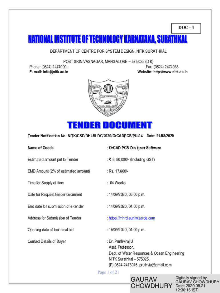 DOC 4DEPARTMENT OF Center FOR SYSTEM DESIGN, NICK URETHRAL POST SRINIVASNAGAR, MANGALORE 575 025 (D K) Phone: (0824) 2474000. Fax: (0824) 2474033 E mail: info@nitk.ac.in Website: http://www.nitk.ac.inTender