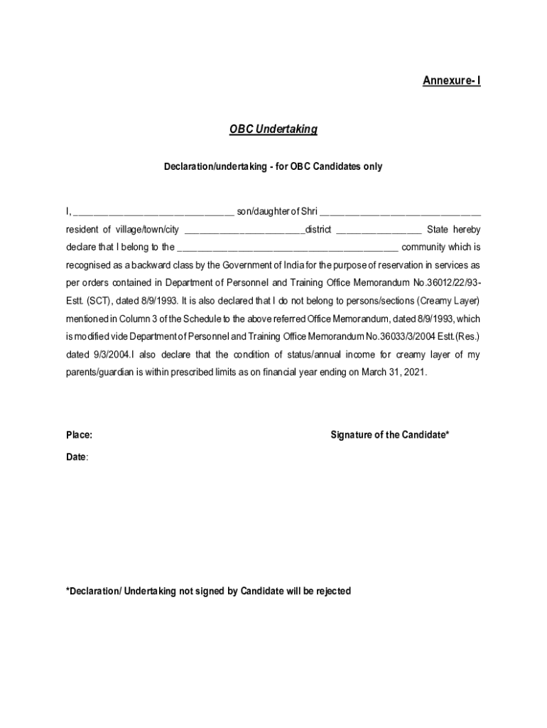 Appendix IOC Undertaking Declaration/undertaking for OBC Candidates only, ___ son/daughter of Sari ___ resident of village/town/city ___district ___ State hereby declare that I belong to the ___ community