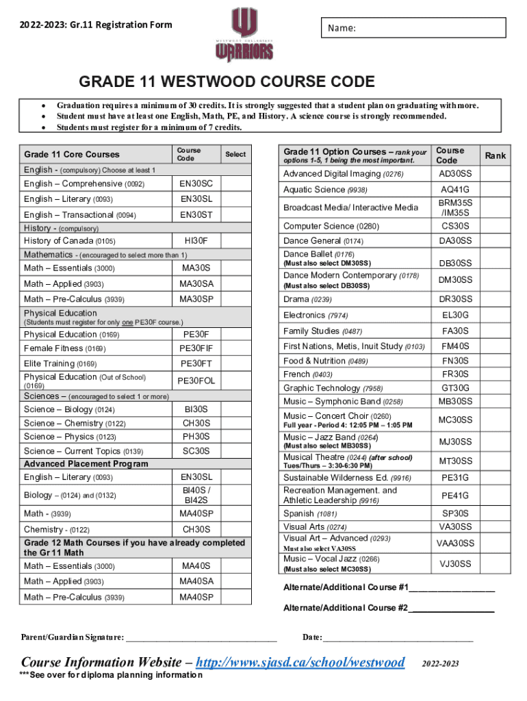 20222023: Gr.11 Registration Forename:GRADE 11 WESTWOOD COURSE CODE Graduation requires a minimum of 30 credits. It is strongly suggested that a student plan on graduating with more. Student must