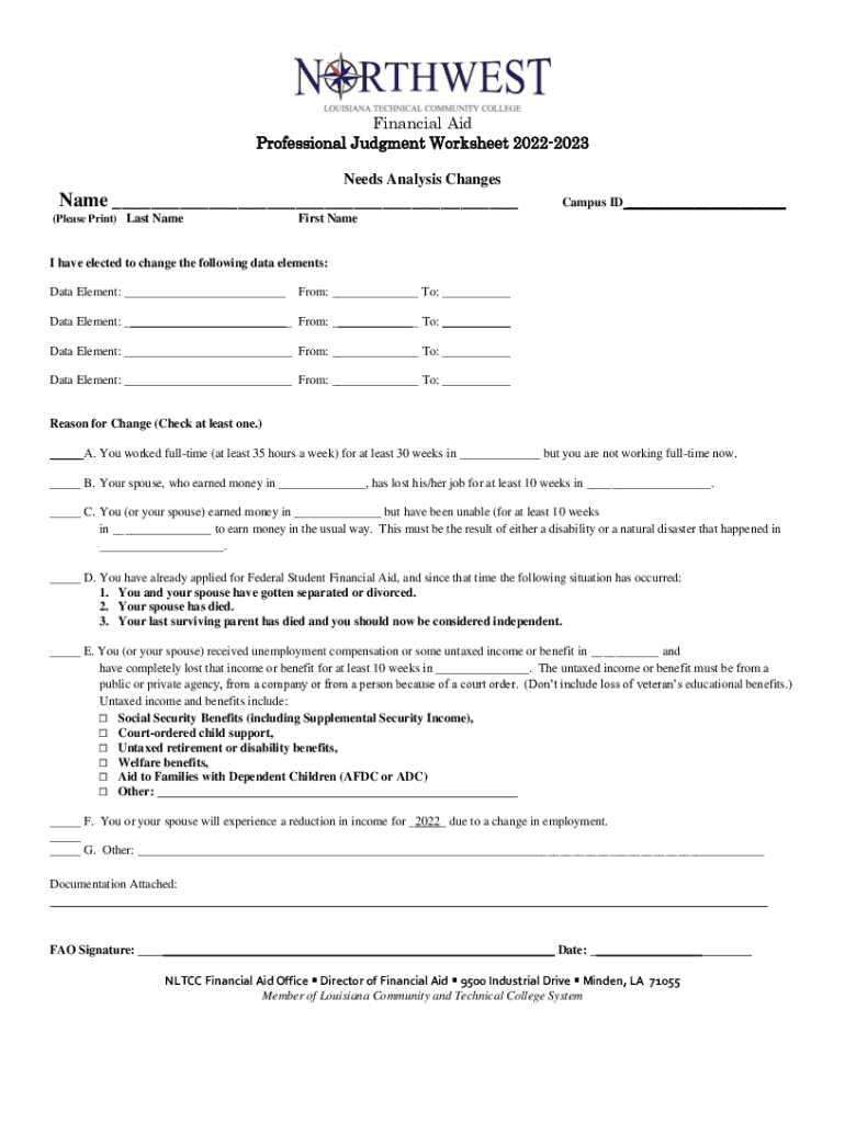 Financial Aid Professional Judgment Worksheet 20222023 Needs Analysis ChangesName ___ (Please Print) Last NameCampus ID ___First Name have elected to change the following data elements: Data Element: