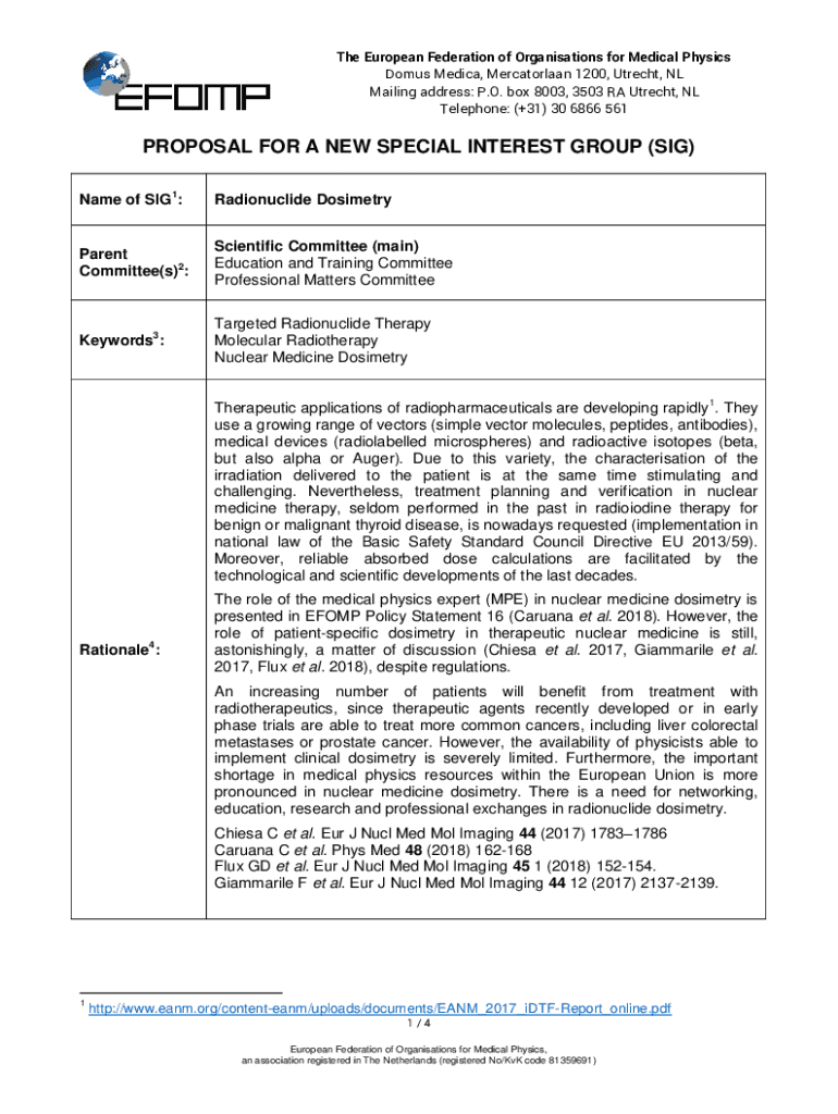 The European Federation of Organizations for Medical Physics Domes Media, Mercatorlaan 1200, Utrecht, NL Mailing address: P.O. box 8003, 3503 RA Utrecht, NL Telephone: (+31) 30 6866 561PROPOSAL FOR