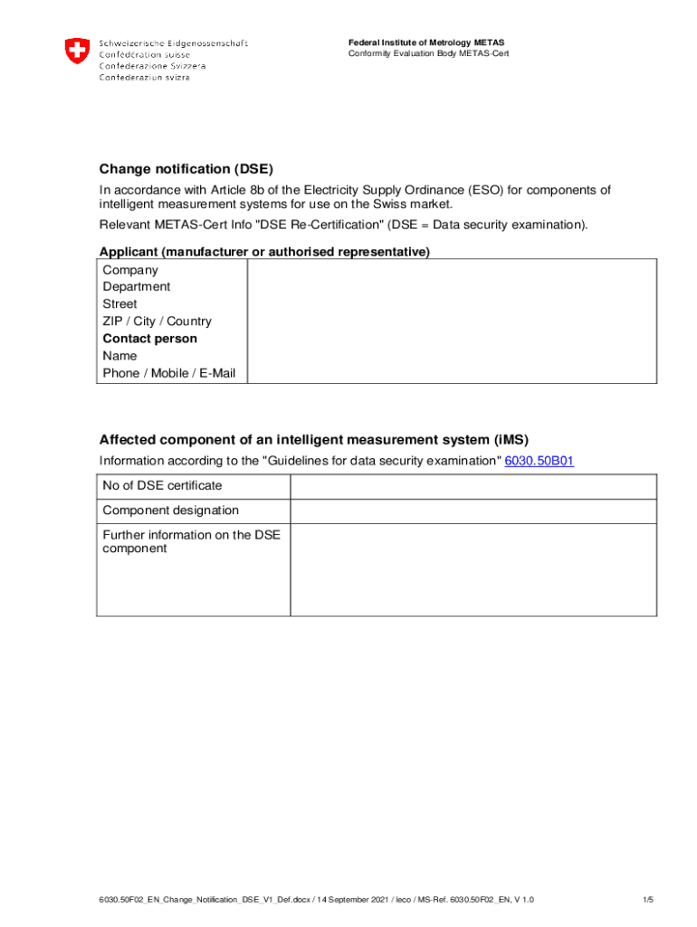 Federal Institute of Metrology METAL Conformity Evaluation Body METASCertChange notification (DSE) In accordance with Article 8b of the Electricity Supply Ordinance (ESO) for components of intelligent