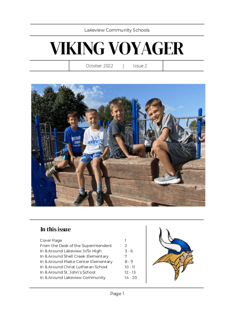 Lake view Community SchoolsVIKING VOYAGER October 2022|Issue 2In this issue Cover Page From the Desk of the Superintendent In & Around Lake view Jr/Sr High In & Around Shell Creek Elementary In &