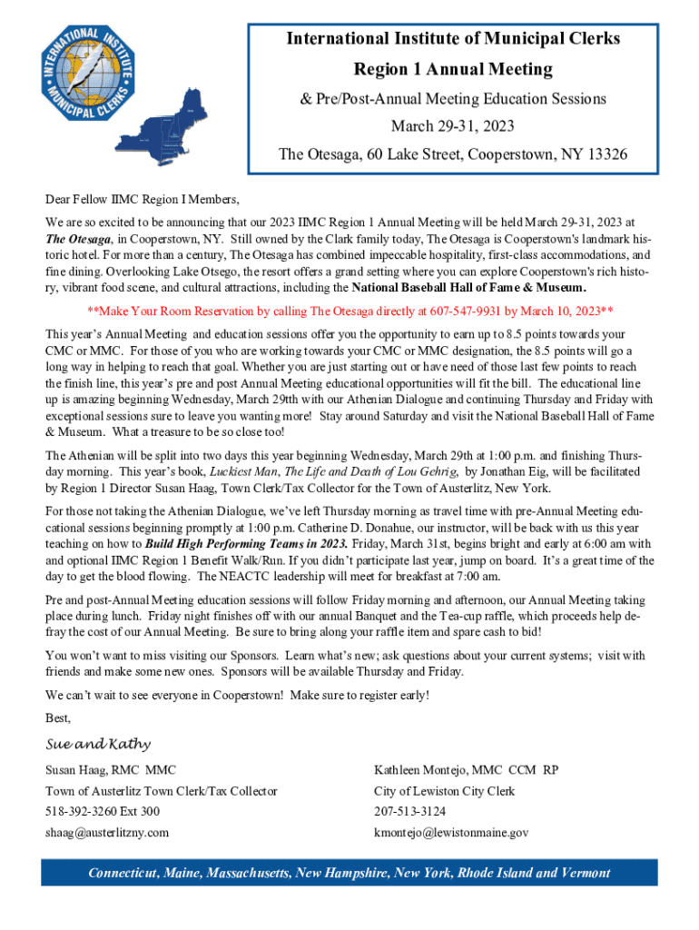 International Institute of Municipal ClerksRegion 1 Annual Meeting & PRE/Postnatal Meeting Education Sessions March 2931, 2023 The Ottawa, 60 Lake Street, Cooperstown, NY 13326 Dear Fellow IMC Region