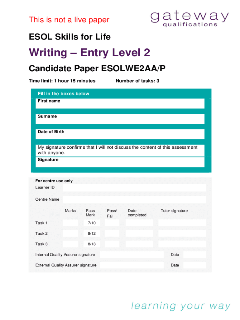 This is not a live papers Skills for Liberating Entry Level 2 Candidate Paper ESOLWE2AA/P Time limit: 1 hour 15 minutesNumber of tasks: 3Fill in the boxes below First nameSurnameDate of Birth signature