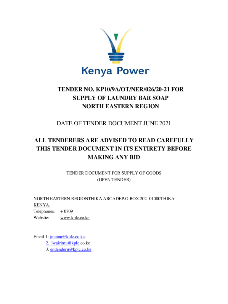 TENDER NO. KP10/9A/OT/NER/026/2021 FOR SUPPLY OF LAUNDRY BAR SOAP NORTH EASTERN REGION DATE OF TENDER DOCUMENT JUNE 2021 ALL TENDERER ARE ADVISED TO READ CAREFULLY THIS TENDER DOCUMENT IN ITS ENTIRETY