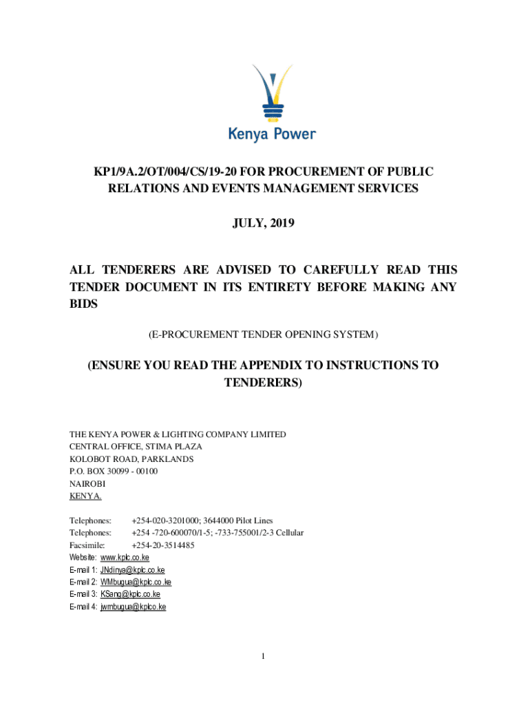 KP1/9A.2/OT/004/CS/1920 FOR PROCUREMENT OF PUBLIC RELATIONS AND EVENTS MANAGEMENT SERVICES JULY, 2019ALL TENDERER ARE ADVISED TO CAREFULLY READ THIS TENDER DOCUMENT IN ITS ENTIRETY BEFORE MAKING ANY