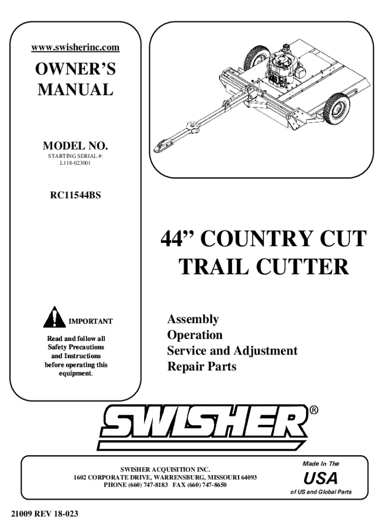WWW.swisher inc. Commoners MANUAL MODEL NO. STARTING SERIAL #: L118023001RC11544BS44 COUNTRY CUT TRAIL CUTTER IMPORTANT Read and follow all Safety Precautions and Instructions before operating this