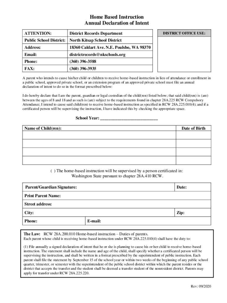 Home Based Instruction Annual Declaration of Intent ATTENTION:District Records DepartmentDISTRICT OFFICE USE:Public School District: North Kit sap School District Address:18360 Cal dart Ave. N.E.