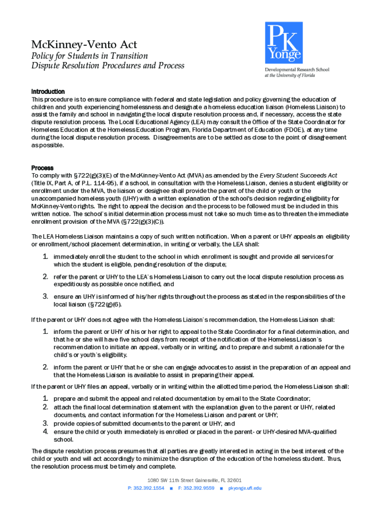 ! McKinneyVento Act Policy for Students in Transition Dispute Resolution Procedures and Process Introduction This procedure is to ensure compliance with federal and state legislation and policy governing