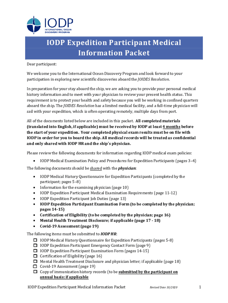 IOP Expedition Participant Medical Information Packet Dear participant:We welcome you to the International Ocean Discovery Program and look forward to your participation in exploring new scientific