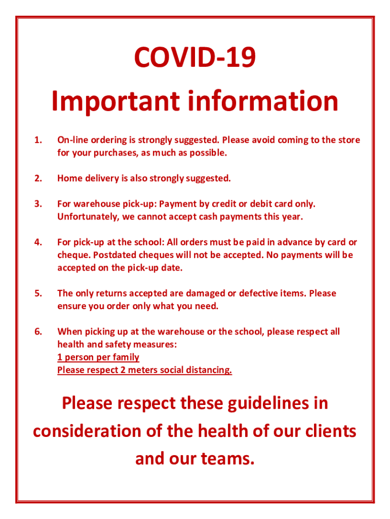 COVID-19 Important information 1. Online ordering is strongly suggested. Please avoid coming to the store for your purchases, as much as possible.2. Home delivery is also strongly suggested.3. For