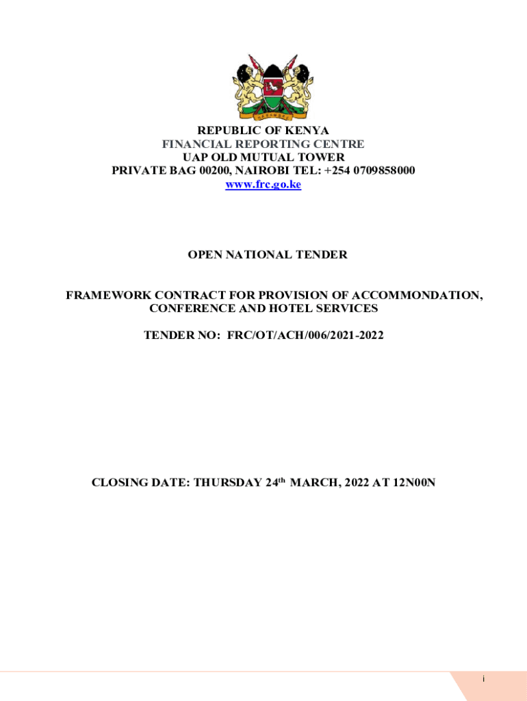 REPUBLIC OF KENYA FINANCIAL REPORTING Center UAP OLD MUTUAL TOWER PRIVATE BAG 00200, NAIROBI TEL: +254 0709858000 www.frc.go.keOPEN NATIONAL TENDER FRAMEWORK CONTRACT FOR PROVISION OF ACCOMMODATION,