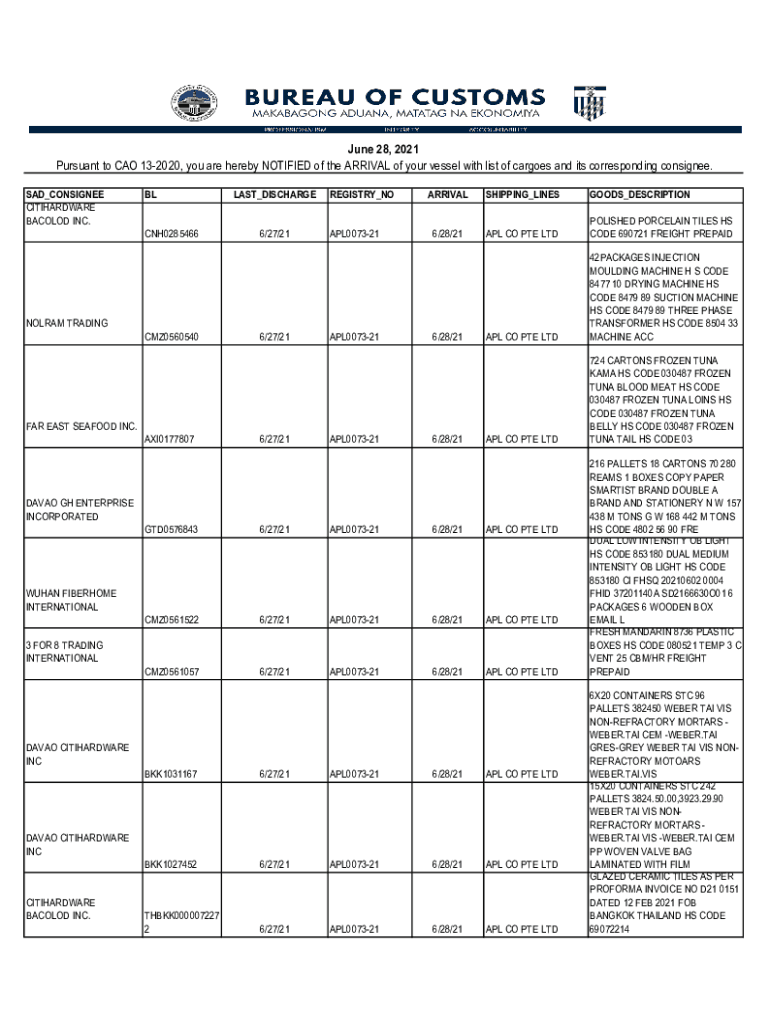 June 28, 2021, Pursuant to CAN 132020, you are hereby NOTIFIED of the ARRIVAL of your vessel with list of cargoes and its corresponding consignee. SAD_CONSIGNEE CITIHARDWARE BACKLOG INC.BLCNH0285466LAST_DISCHARGE6/27/21REGISTRY_NOAPL007321ARRIVALSHIPPING_LINES