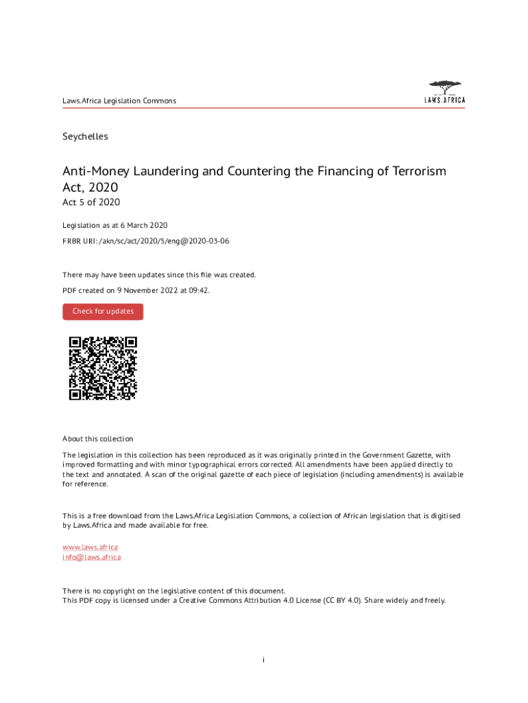 Laws. Africa Legislation CommonsSeychellesAntiMoney Laundering and Countering the Financing of Terrorism Act, 2020 Act 5 of 2020 Legislation as at 6 March 2020 FRBR URI: /AKN/SC/act/2020/5/eng@20200306There