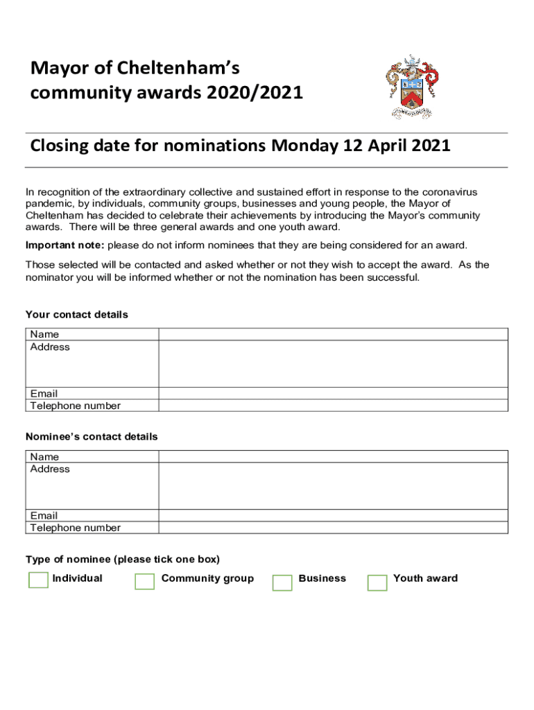 Get the free Nomination form for the Mayor of Cheltenham's community awards