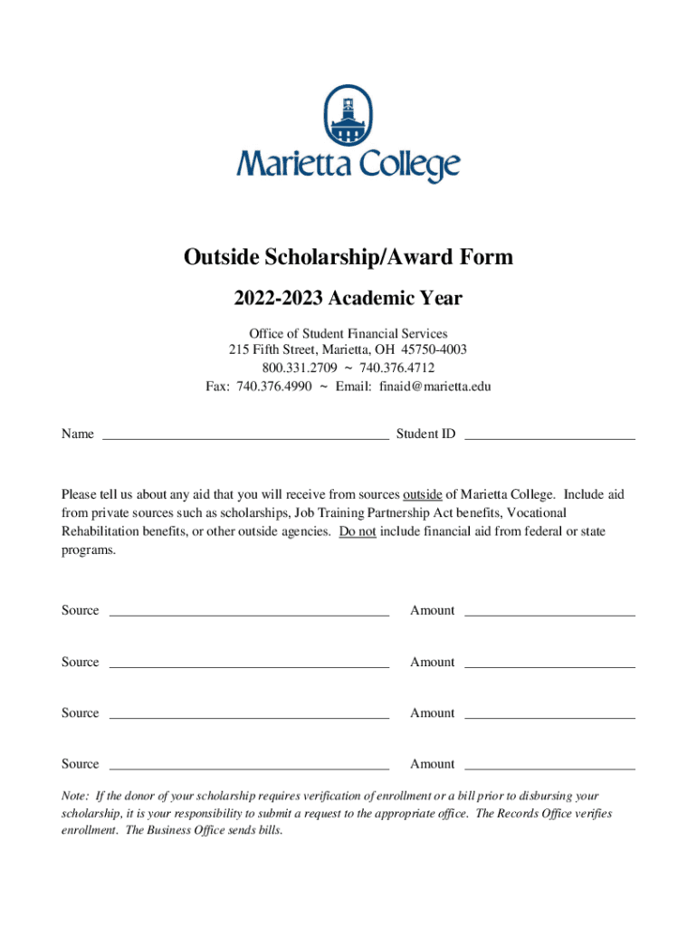 Outside Scholarship/Award Form 20222023 Academic Year Office of Student Financial Services 215 Fifth Street, Marietta, OH 457504003 800.331.2709 740.376.4712 Fax: 740.376.4990 Email: finaid@marietta.edu