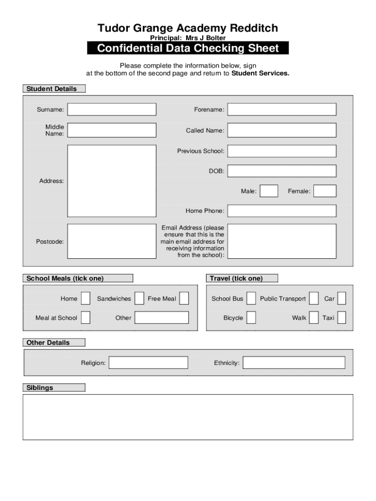 Tudor Grange Academy Red ditch Principal: Mrs J BolterConfidential Data Checking Sheet Please complete the information below, sign at the bottom of the second page and return to Student Services.