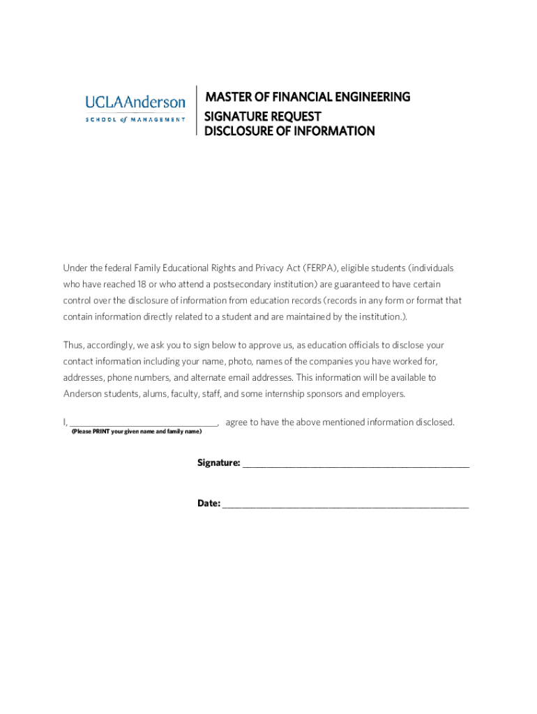 MASTER OF FINANCIAL ENGINEERING SIGNATURE REQUEST DISCLOSURE OF INFORMATIONUnder the federal Family Educational Rights and Privacy Act (FER PA), eligible students (individuals who have reached 18