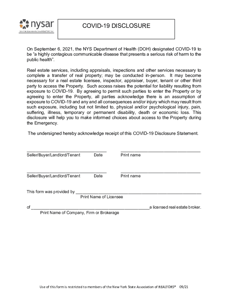 COVID-19 Disclosure September 6, 2021, the NYS Department of Health (DOH) designated COVID-19 to be a highly contagious communicable disease that presents a serious risk of harm to the public health.