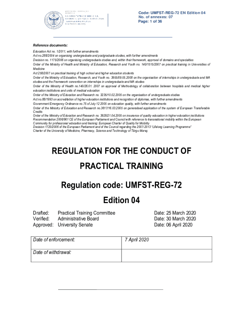 Code: UMFSTREG72 EN Edition 04 No. of annexes: 07 Page: 1 of 36Reference documents: Education Act no. 1/2011, with further amendments Act no.288/2004 on organizing undergraduate and postgraduate studies,