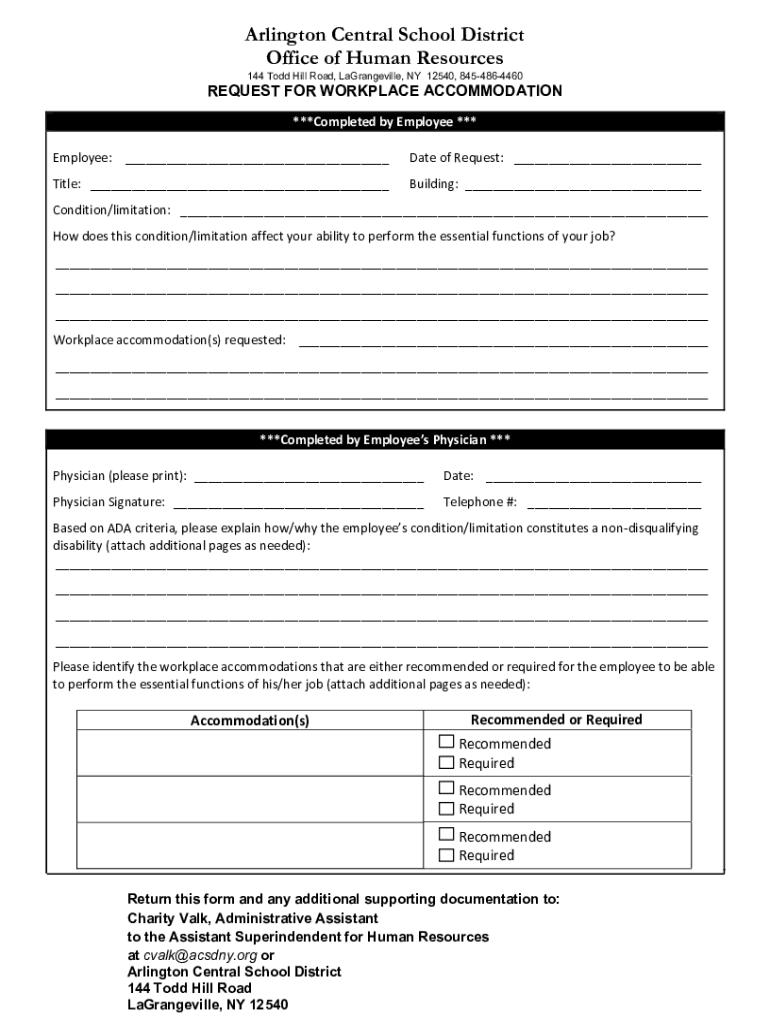 Arlington Central School District Office of Human Resources 144 Todd Hill Road, Lawrenceville, NY 12540, 8454864460REQUEST FOR WORKPLACE ACCOMMODATION ***Completed by Employee *** Employee: ___Date