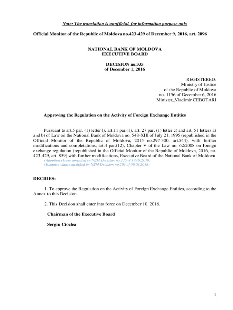 Note: The translation is unofficial, for information purpose only Official Monitor of the Republic of Moldova no.423429 of December 9, 2016, art. 2096NATIONAL BANK OF MOLDOVA EXECUTIVE BOARD DECISION