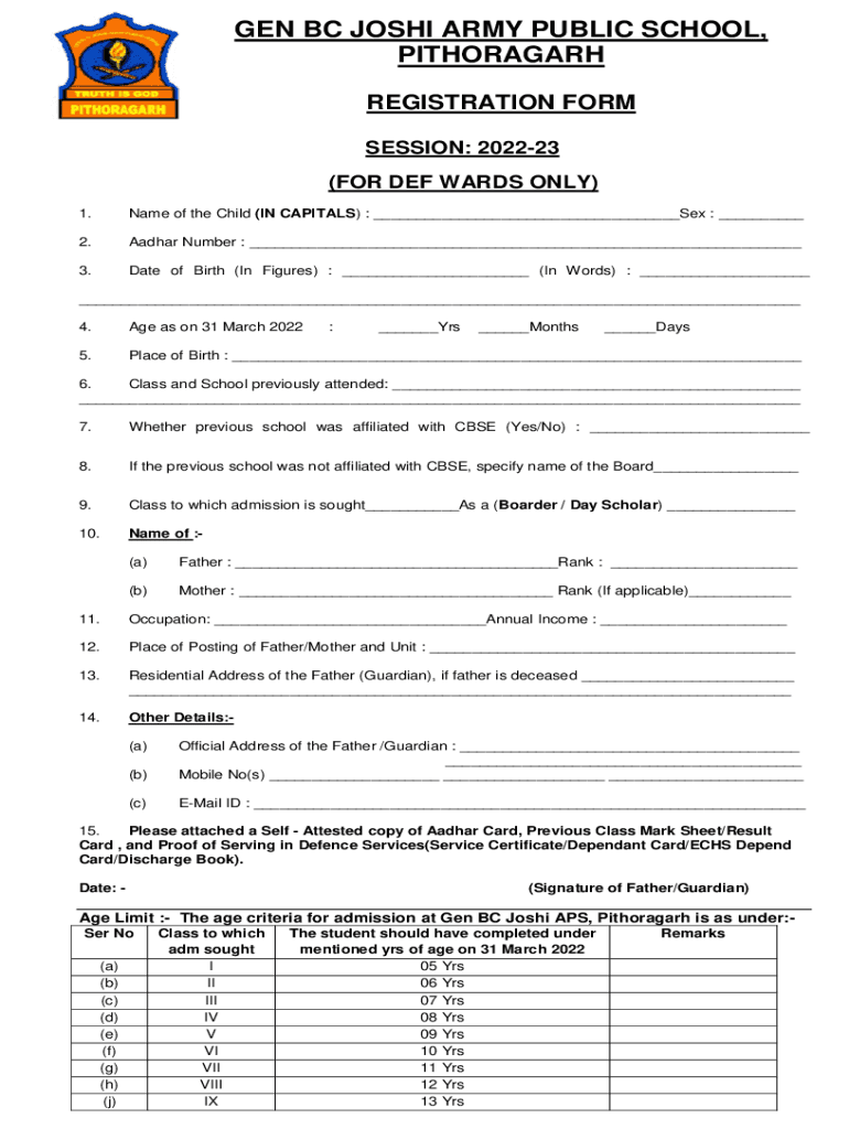 GEN BC JOSHI ARMY PUBLIC SCHOOL, PITHORAGARH REGISTRATION FORM SESSION: 202223 (FOR DEF WARDS ONLY) 1. Name of the Child (IN CAPITALS) : ___Sex : ___2. Aadhaar Number : ___3. Date of Birth (In Figures)