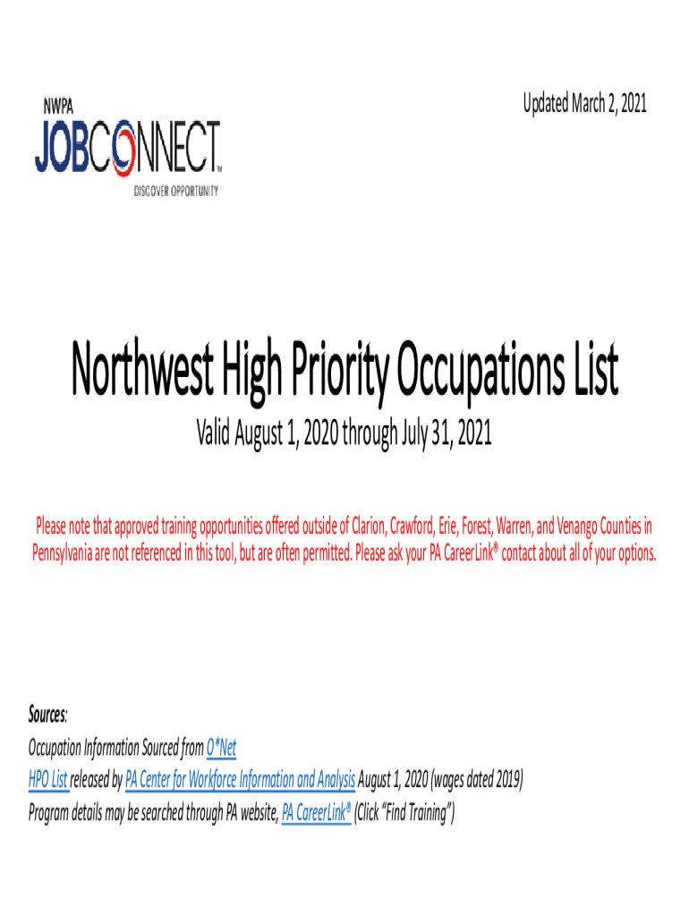 Updated March 2, 2021Northwest High Priority Occupations List Valid August 1, 2020, through July 31, 2021Please note that approved training opportunities offered outside of Clarion, Crawford, Erie,