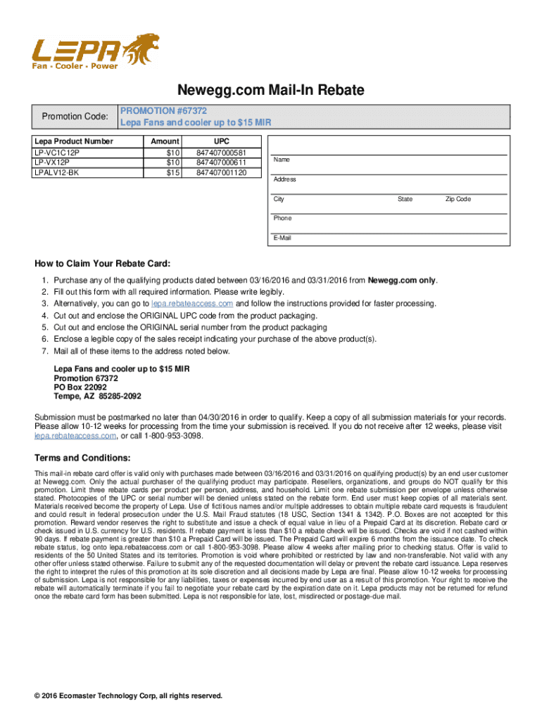 Newegg.com Mailing Rebate Promotion Code:PROMOTION #67372 Leap Fans and cooler up to $15 Milena Product Number LPVC1C12P LPVX12P LPALV12BKAmount $$$101015UPC 847407000581 847407000611 847407001120Name