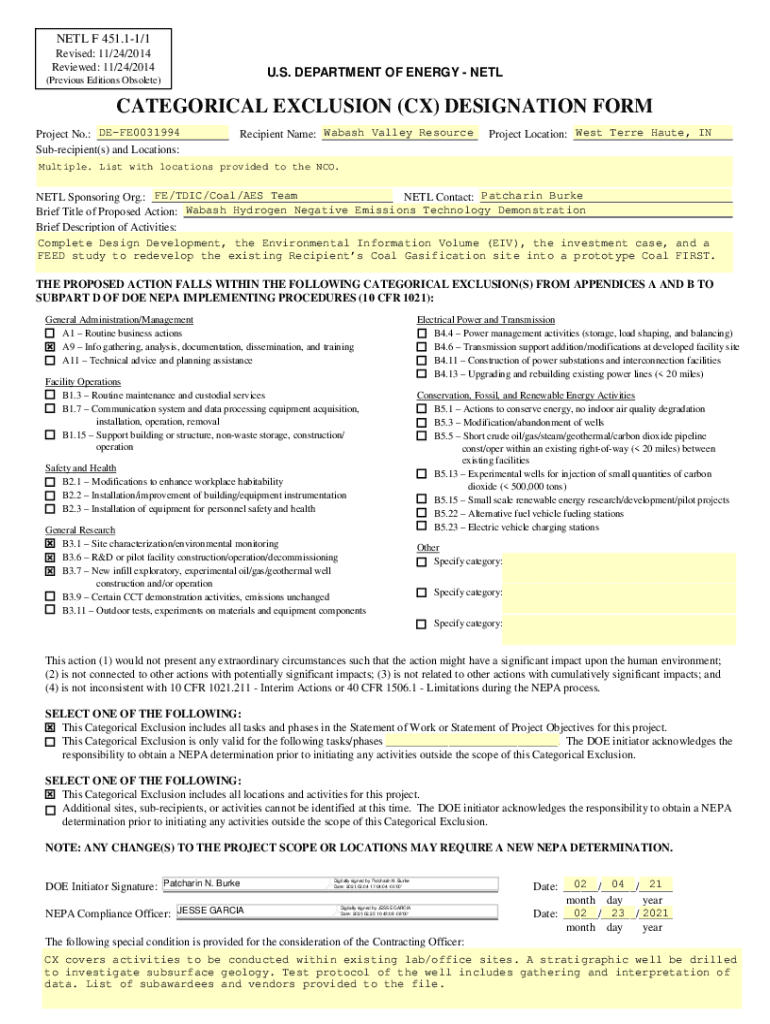 NET F 451.11/1 Revised: 11/24/2014 Reviewed: 11/24/2014U. S. DEPARTMENT OF ENERGY NET(Previous Editions Obsolete)CATEGORICAL EXCLUSION (CX) DESIGNATION FORM Project No.: DEFE0031994 Subrecipient(s)