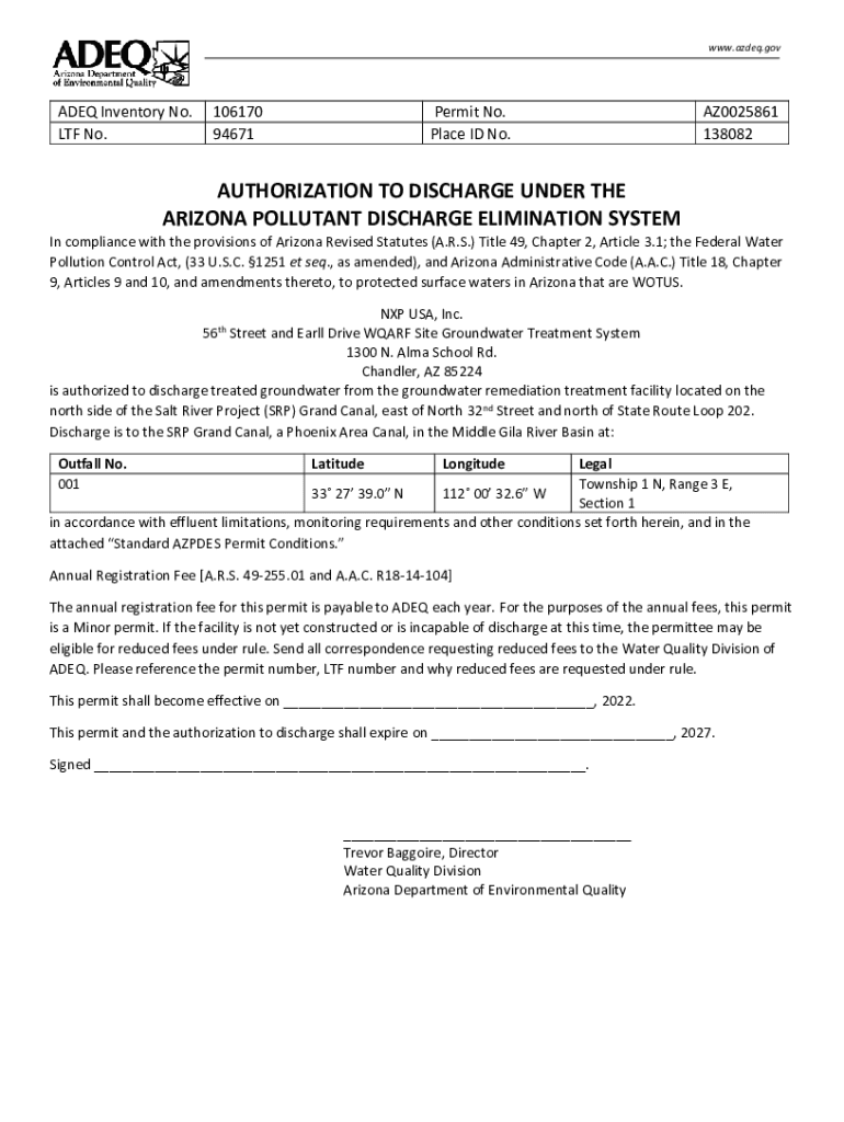 WWW.added.goaded Inventory No. LTF No.106170 94671Permit No. Place ID No.AZ0025861 138082 SouthernAUTHORIZATION TO DISCHARGE UNDER THE ARIZONA POLLUTANT DISCHARGE ELIMINATION SYSTEMRegional Office400