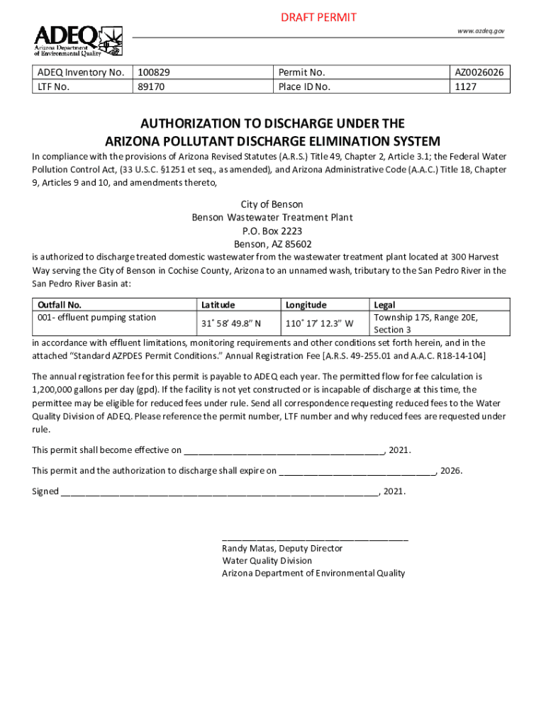 DRAFT PERMIT www.azdeq.govADEQ Inventory No. LTF No.100829 89170Permit No. Place ID No.AZ0026026 1127 SouthernAUTHORIZATION TO DISCHARGE UNDER THE ARIZONA POLLUTANT DISCHARGE ELIMINATION SYSTEMRegional