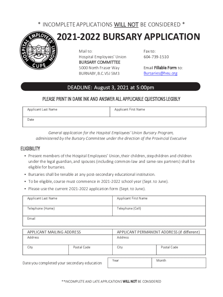 * INCOMPLETE APPLICATIONS WILL NOT BE CONSIDERED *20212022 BURSARY APPLICATION Mail to: Hospital Employees Union BURSARY COMMITTEE 5000 North Fraser Way BURNABY, B.C. V5J 5M3Fax to: 6047391510 Email