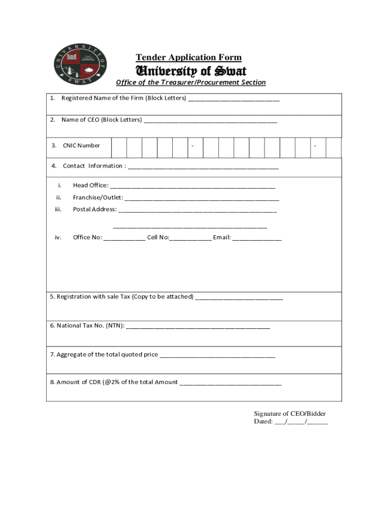 Tender Application Preuniversity of Swat Office of the Treasurer/Procurement Section 1. Registered Name of the Firm (Block Letters) ___ 2. Name of CEO (Block Letters) ___3. CNIC Number4. Contact Information
