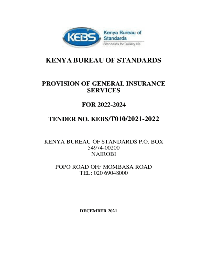 KENYA BUREAU OF STANDARDSPROVISION OF GENERAL INSURANCE SERVICES FOR 20222024 TENDER NO. KEYS/T010/20212022KENYA BUREAU OF STANDARDS P.O. BOX 5497400200 NAIROBI POP ROAD OFF MOMBASA ROAD TEL: 020