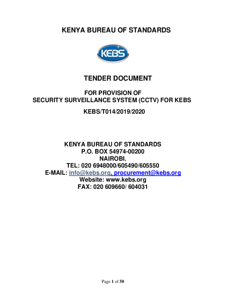 KENYA BUREAU OF STANDARDSTENDER DOCUMENT FOR PROVISION OF SECURITY SURVEILLANCE SYSTEM (CCTV) FOR KEYS/T014/2019/2020KENYA BUREAU OF STANDARDS P.O. BOX 5497400200 NAIROBI. TEL: 020 6948000/605490/605550