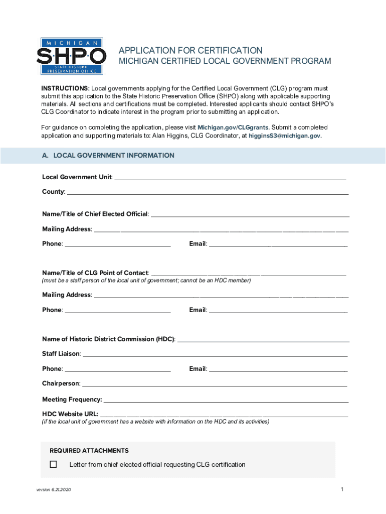 APPLICATION FOR CERTIFICATION MICHIGAN CERTIFIED LOCAL GOVERNMENT PROGRAM INSTRUCTIONS: Local governments applying for the Certified Local Government (CLG) program must submit this application to