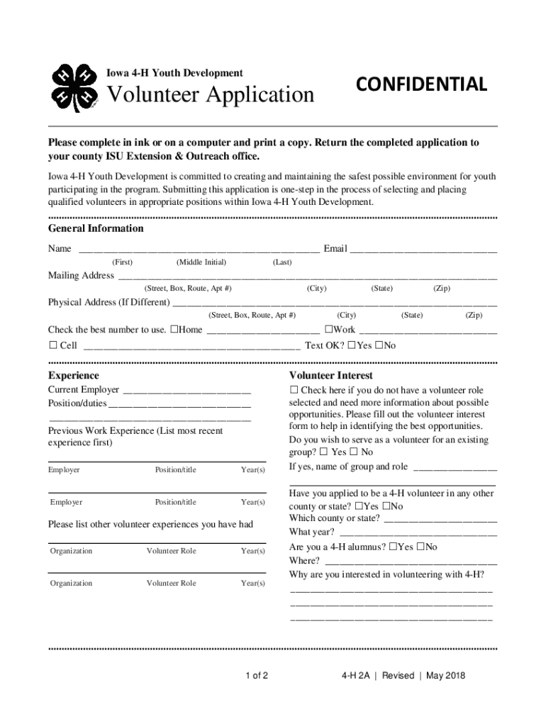Iowa 4H Youth DevelopmentVolunteer ApplicationCONFIDENTIAL___ Please complete in ink or on a computer and print a copy. Return the completed application to your county ISU Extension & Outreach office.
