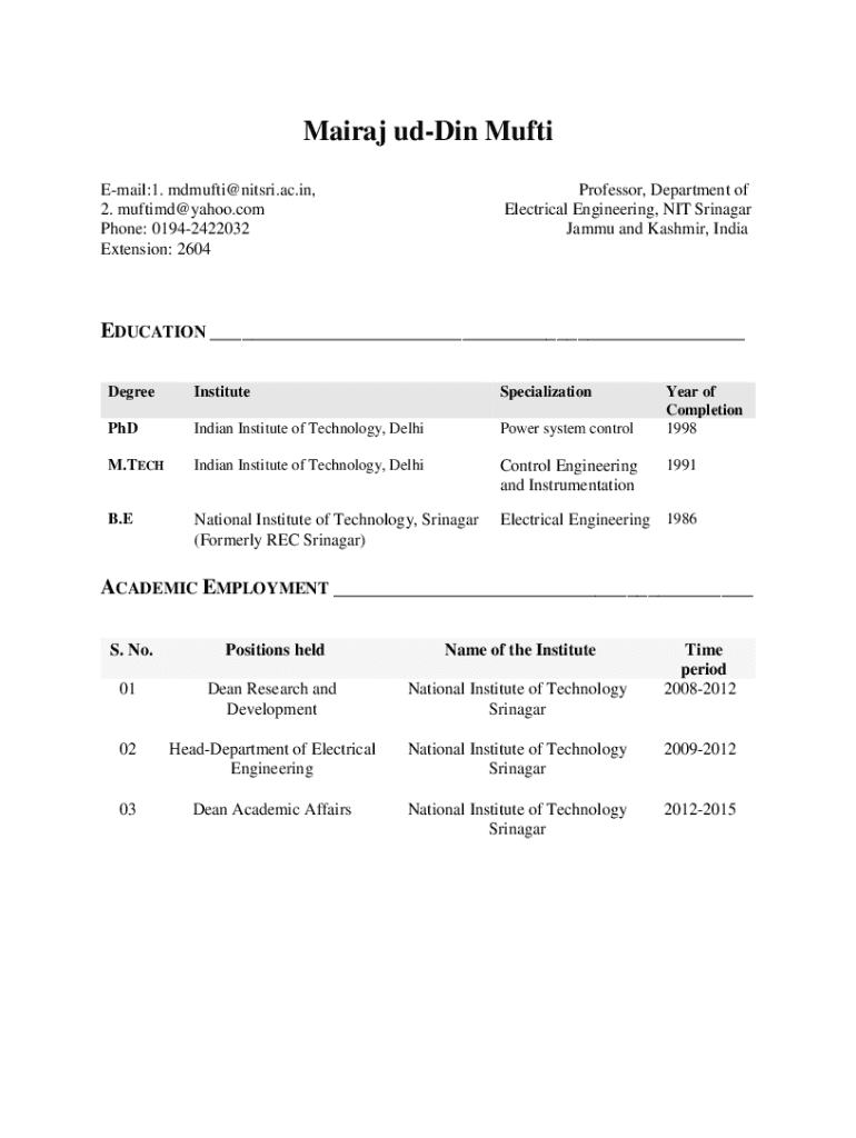 Area adding Mufti Email:1. mdmufti@nitsri.ac.in, 2. muftimd@yahoo.com Phone: 01942422032 Extension: 2604Professor, Department of Electrical Engineering, NIT Srinagar Jammy and Kashmir, Individuation