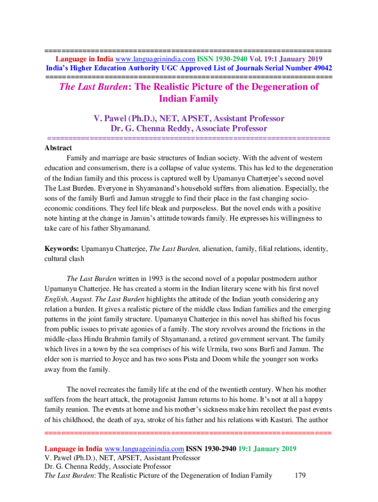 Language in India www.languageinindia.com ISSN 19302940 Vol. 19:1 January 2019 India's Higher Education Authority UGC Approved List of Journals Serial Number 49042 The Last Burden: The Realistic Picture