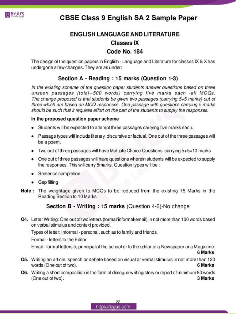 CBSE Class 9 English SA 2 Sample Paper ENGLISH LANGUAGE AND LITERATURE Classes IX Code No. 184 The design of the question papers in English Language and Literature for classes IX & X has undergone