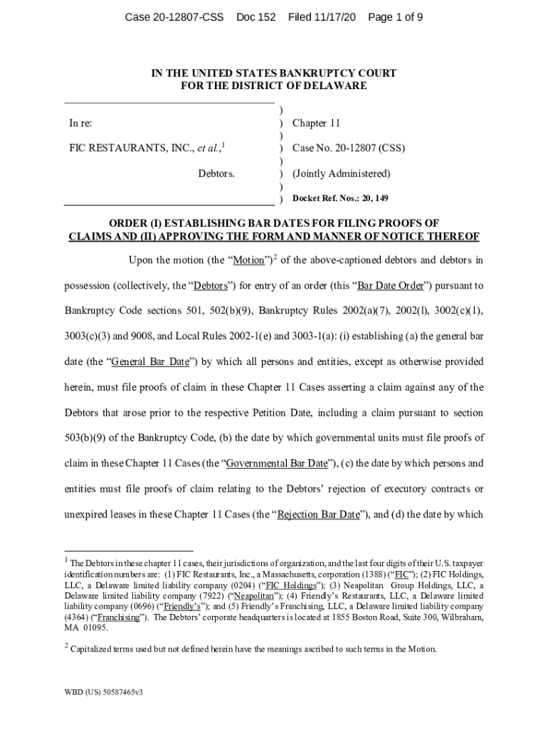 Case 2012807CSSDoc 152Filed 11/17/20Page 1 of 9IN THE UNITED STATES BANKRUPTCY COURT FOR THE DISTRICT OF DELAWARE In re: FIC RESTAURANTS, INC., et al.,1 Debtors.) )))))))Chapter 11 Case No. 2012807