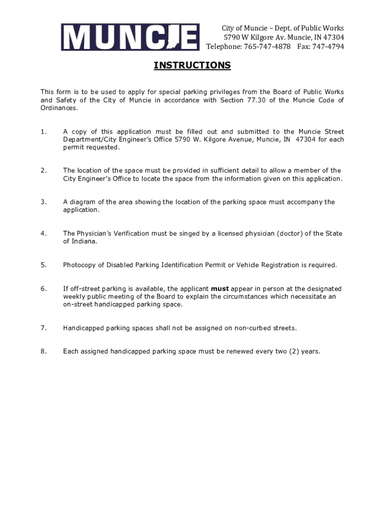 City of Muncie Dept. of Public Works 5790 W Kilgore Av. Muncie, IN 47304 Telephone: 7657474878 Fax: 7474794INSTRUCTIONSThis form is to be used to apply for special parking privileges from the Board