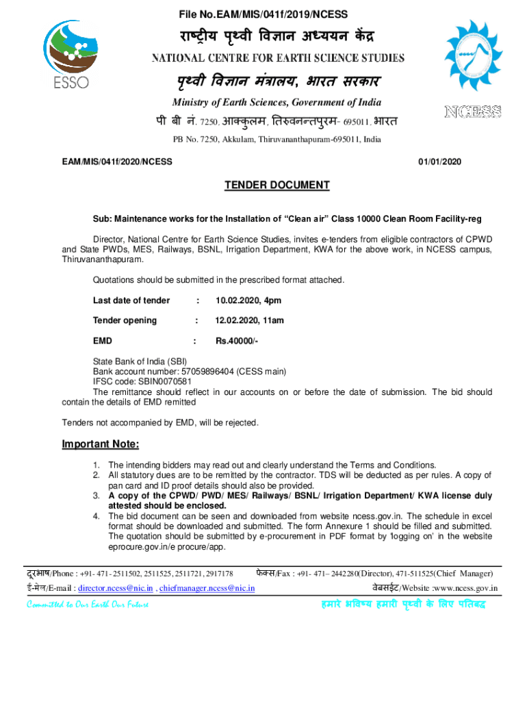 File No.EAM/MIS/041f/2019/NCESS Ministry of Earth Sciences, Government of India. 7250, 695011, PB No. 7250, Angular, Thiruvananthapuram695011, India EAM/MIS/041f/2020/NCESS01/01/2020TENDER
