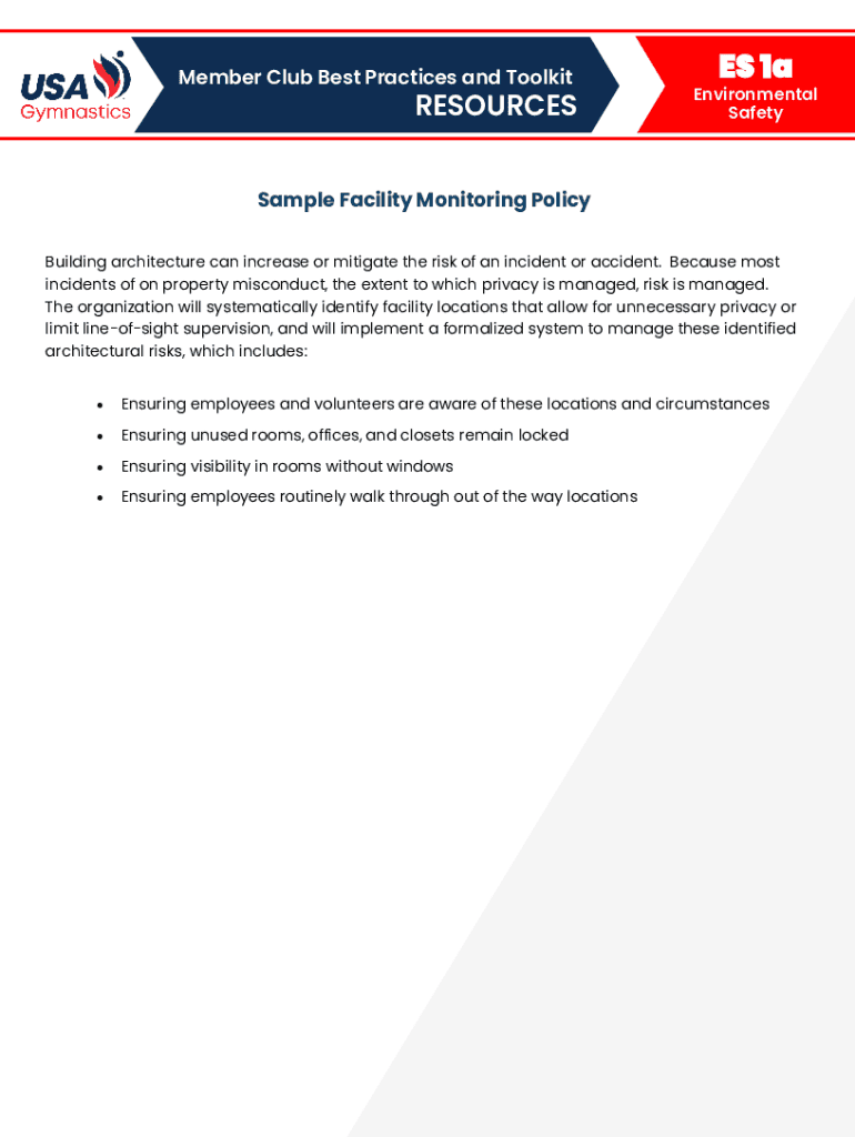 Member Club Best Practices and ToolkitRESOURCESES 1aEnvironmental SafetySample Facility Monitoring Policy Building architecture can increase or mitigate the risk of an incident or accident. Because