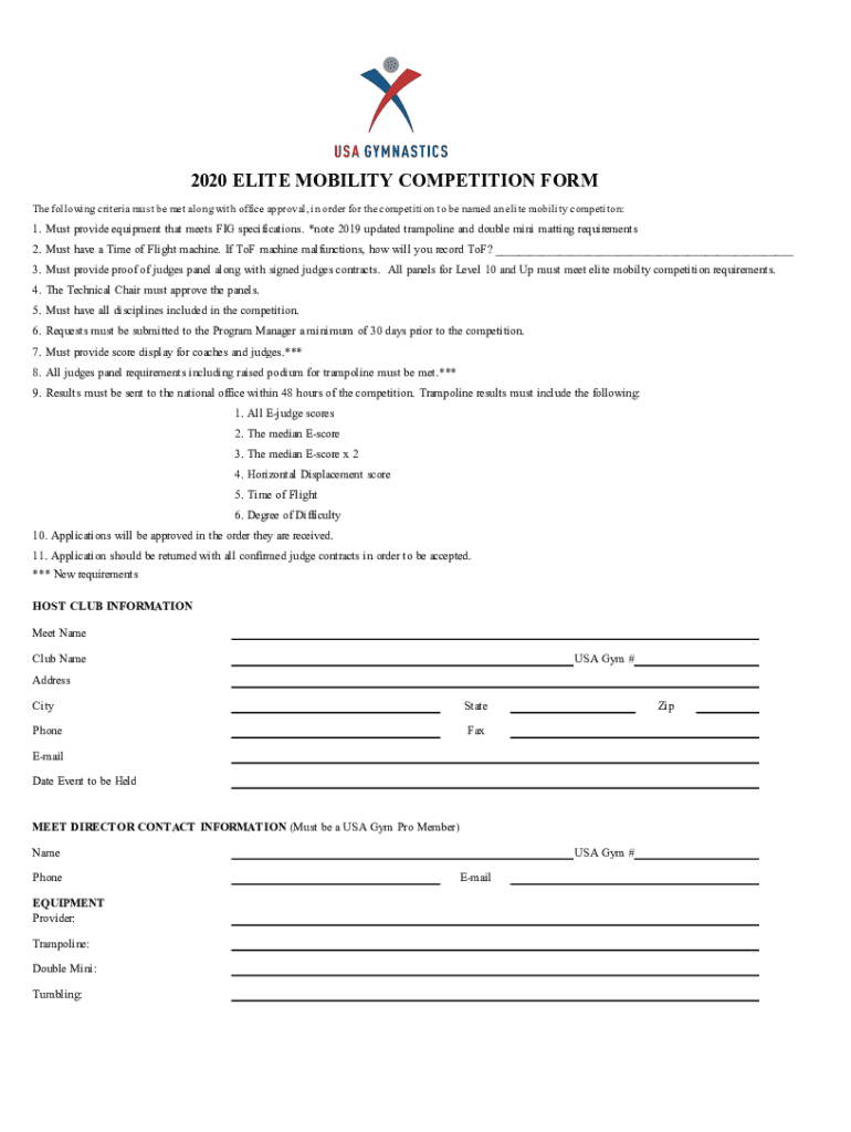 2020 ELITE MOBILITY COMPETITION FORM The following criteria must be met along with office approval, in order for the competition to be named an elite mobility competition:1. Must provide equipment