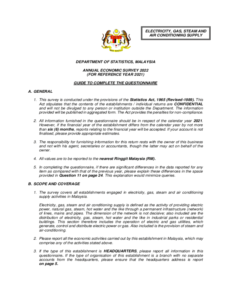 ELECTRICITY, GAS, STEAM AND AIR CONDITIONING SUPPLYDEPARTMENT OF STATISTICS, MALAYSIA ANNUAL ECONOMIC SURVEY 2022 (FOR REFERENCE YEAR 2021) GUIDE TO COMPLETE THE QUESTIONNAIRE A. GENERAL 1. This survey
