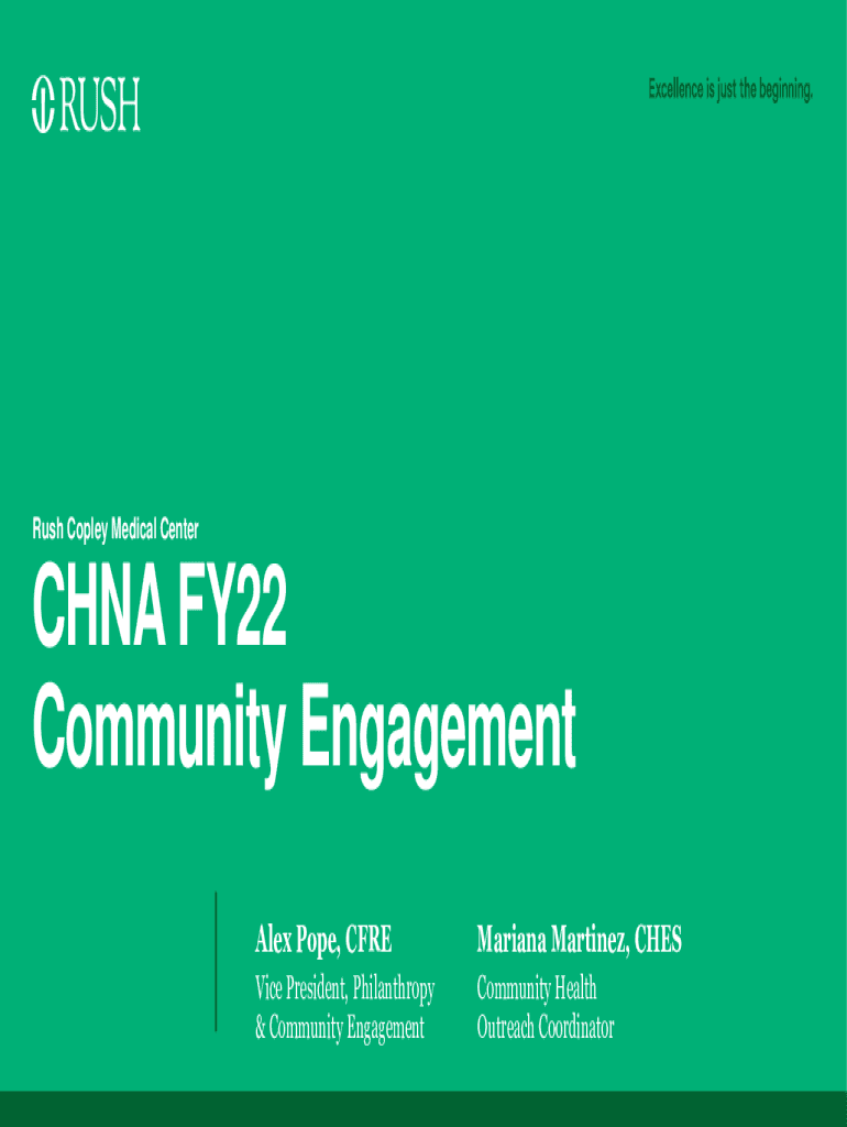 Rush Copley Medical Centering FY22 Community Engagement Alex Pope, CFREMariana Martinez, Cheshire President, Philanthropy & Community EngagementCommunity Health Outreach CoordinatorCommunity EngagementCommunity