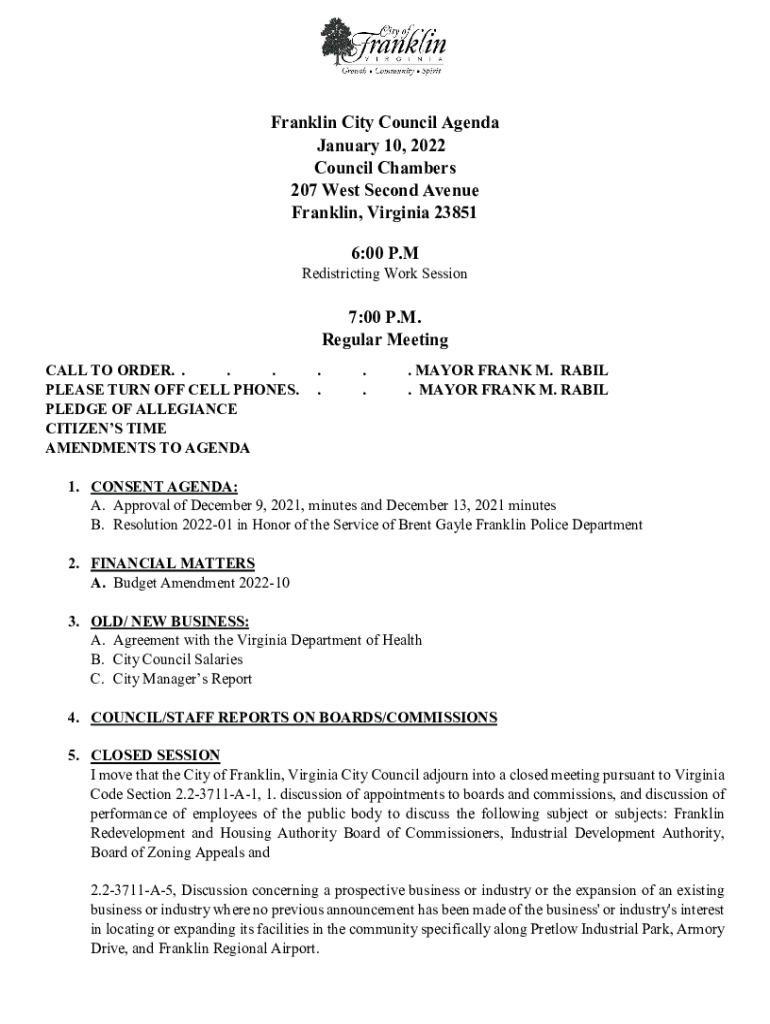M 1ff1? Growth Community Spirit Franklin City Council Agenda January 10, 2022, Council Chambers 207 West Second Avenue Franklin, Virginia 23851 6:00 P. Redistricting Work Session7:00 P.M. Regular